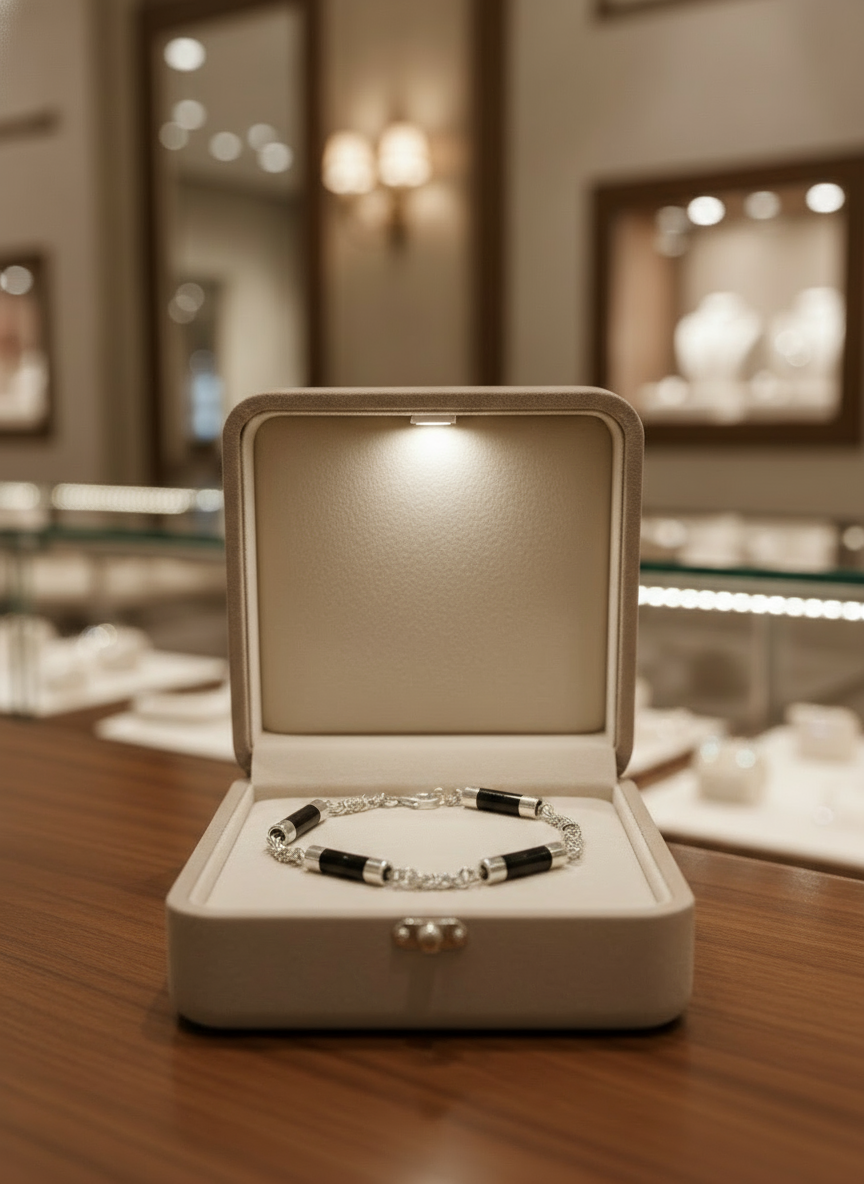 The design draws inspiration from classic Mediterranean chain work, merging traditional silversmithing with a contemporary minimalist edge. Light-catching and durable, Ebon Line embodies quiet confidence — a versatile piece that complements both casual and formal styles.
